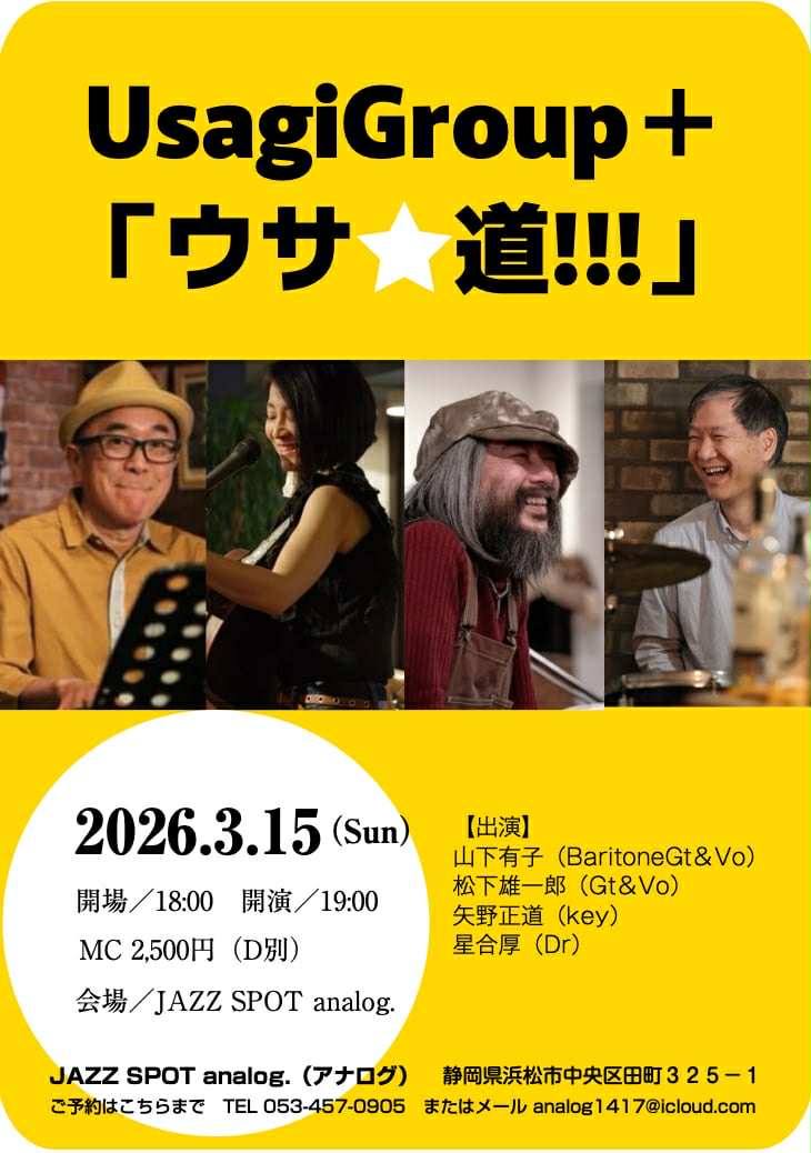・出演:[Usagi Group] 山下有子(vo, baritone guitar)、松下雄一郎(g,vo)、星合 厚(ds)